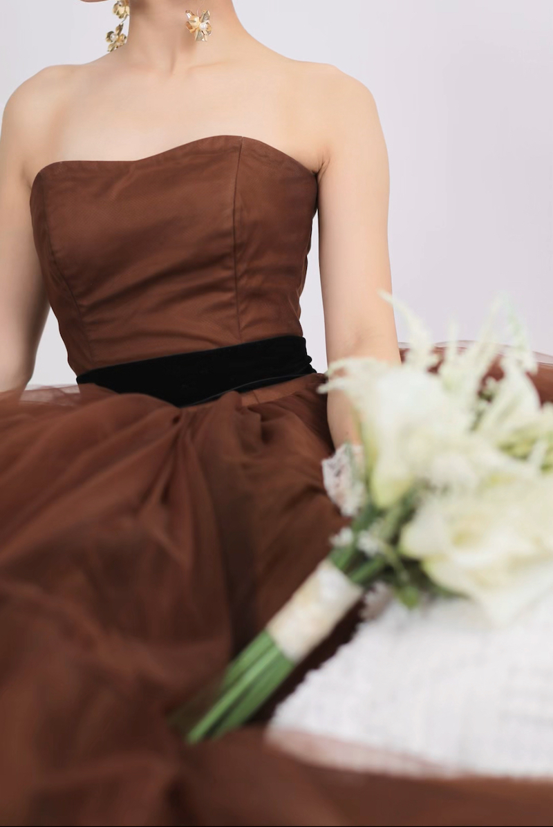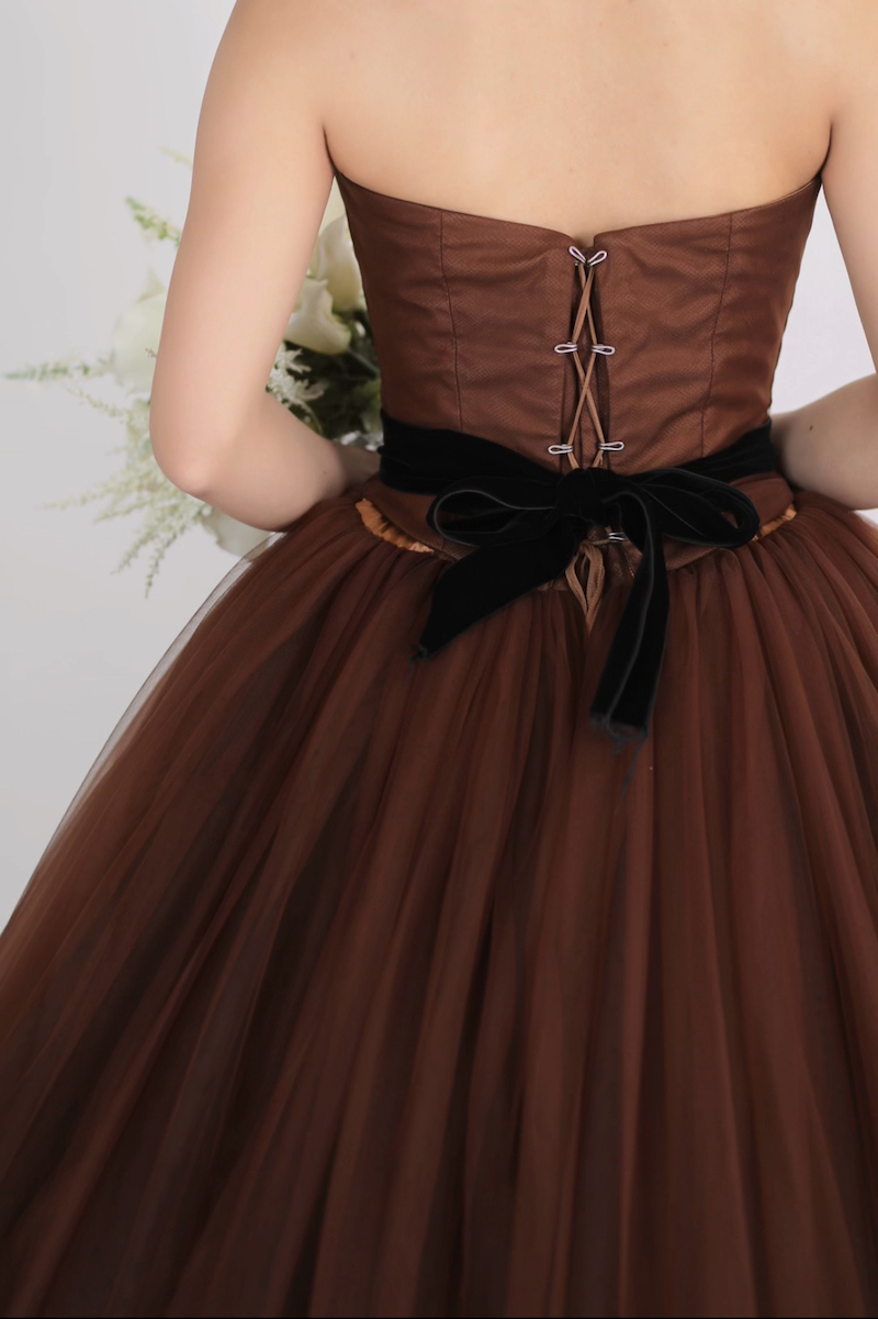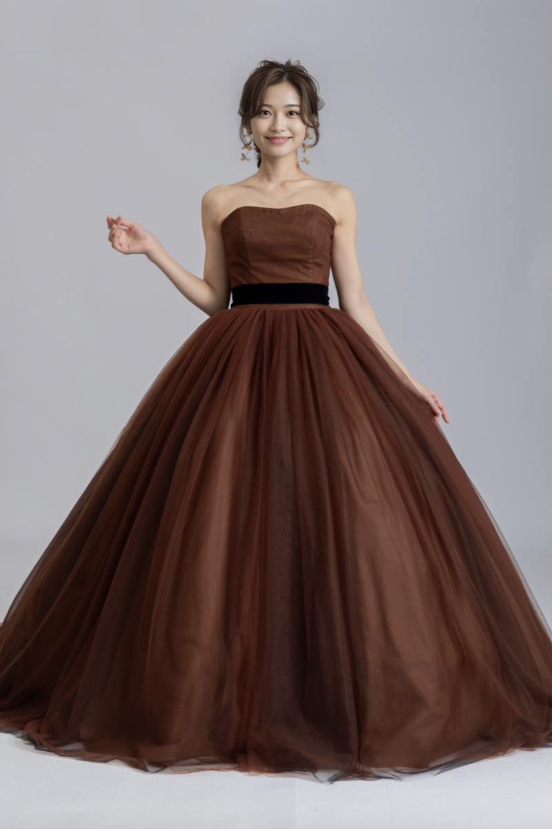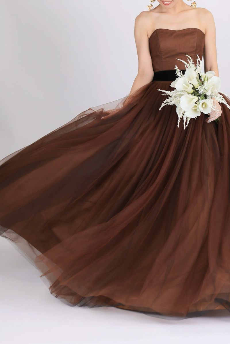 スカート部分には、ブラウンだけじゃなくブラックのチュールも重ねられているので、深みのあるブラウンになっています。