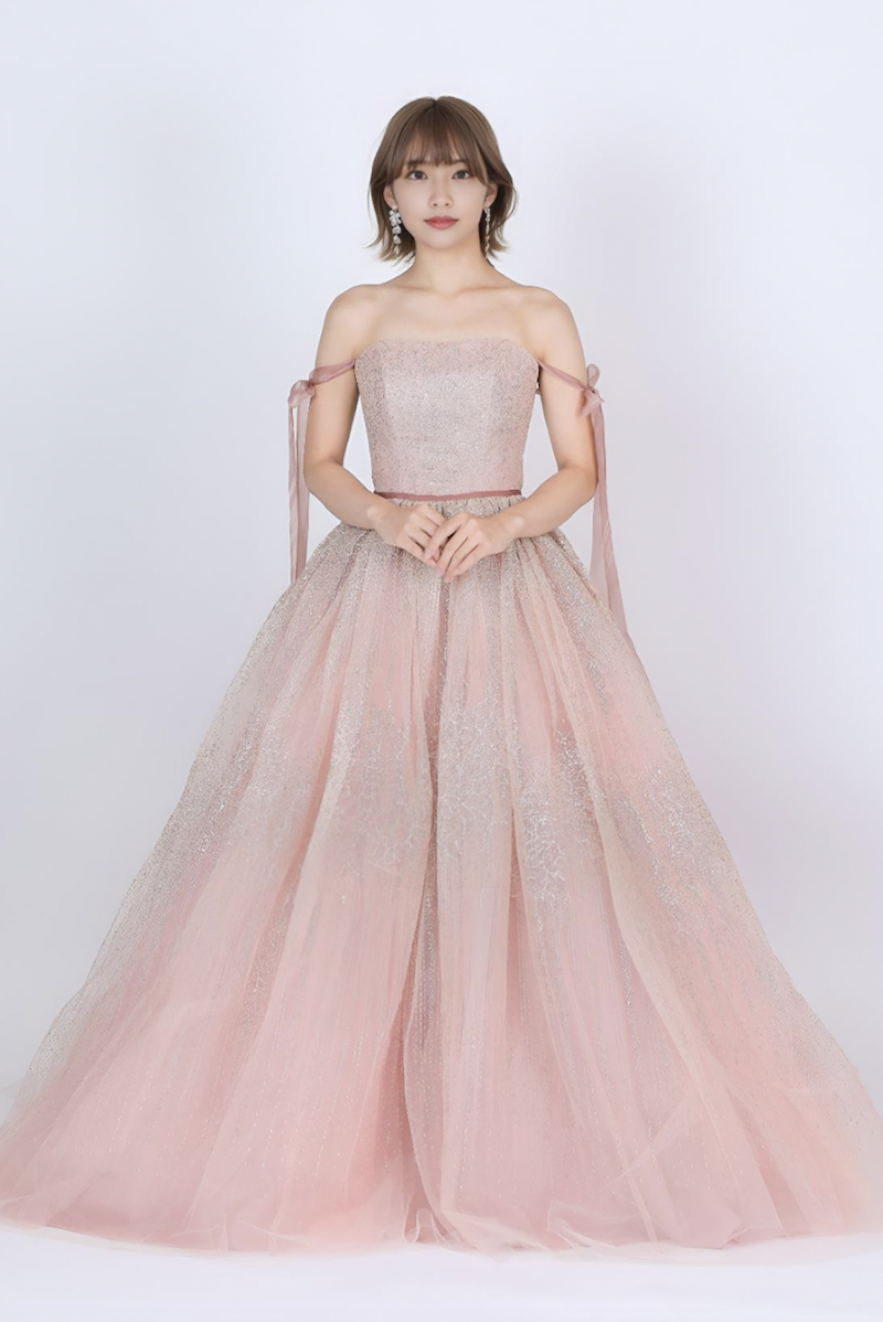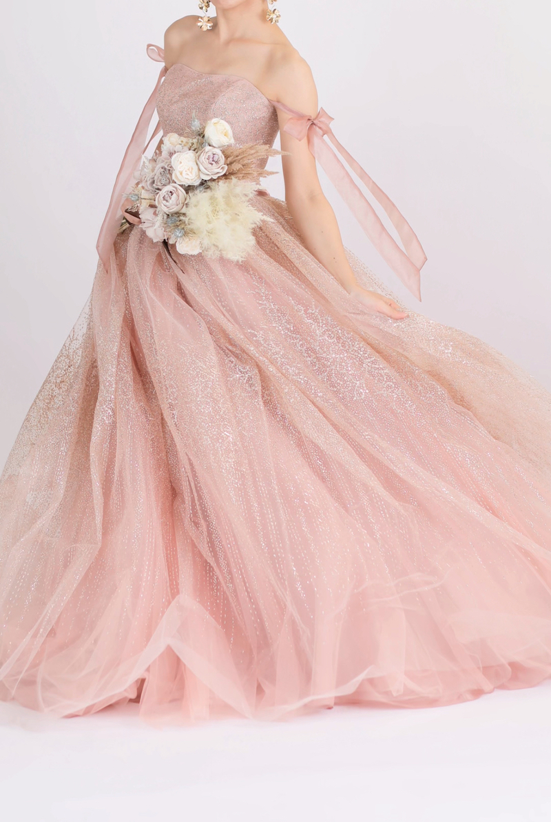 明るすぎず、濃すぎないピンクで、ラメも派手すぎず細かく入っているので、可愛くなりすぎない大人可愛いドレスです。