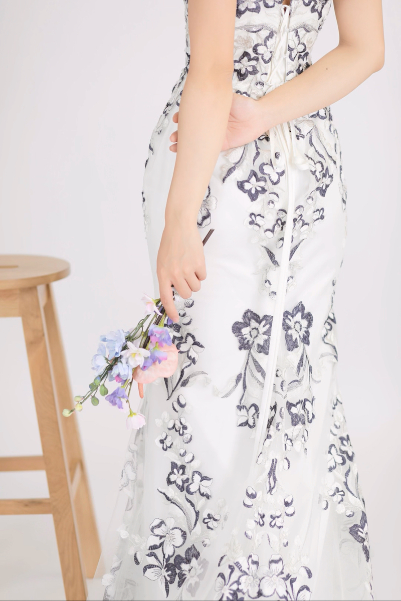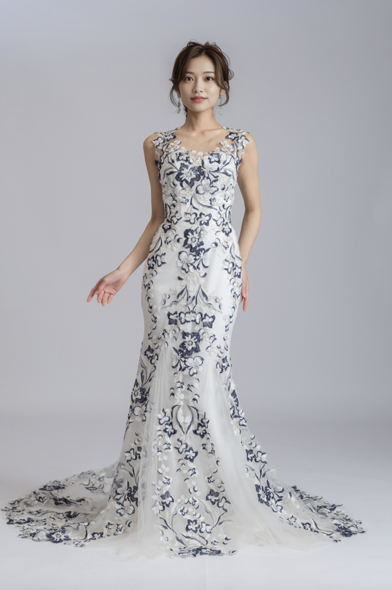 最後はネイビーの刺繍がお洒落なマーメイドドレスです。